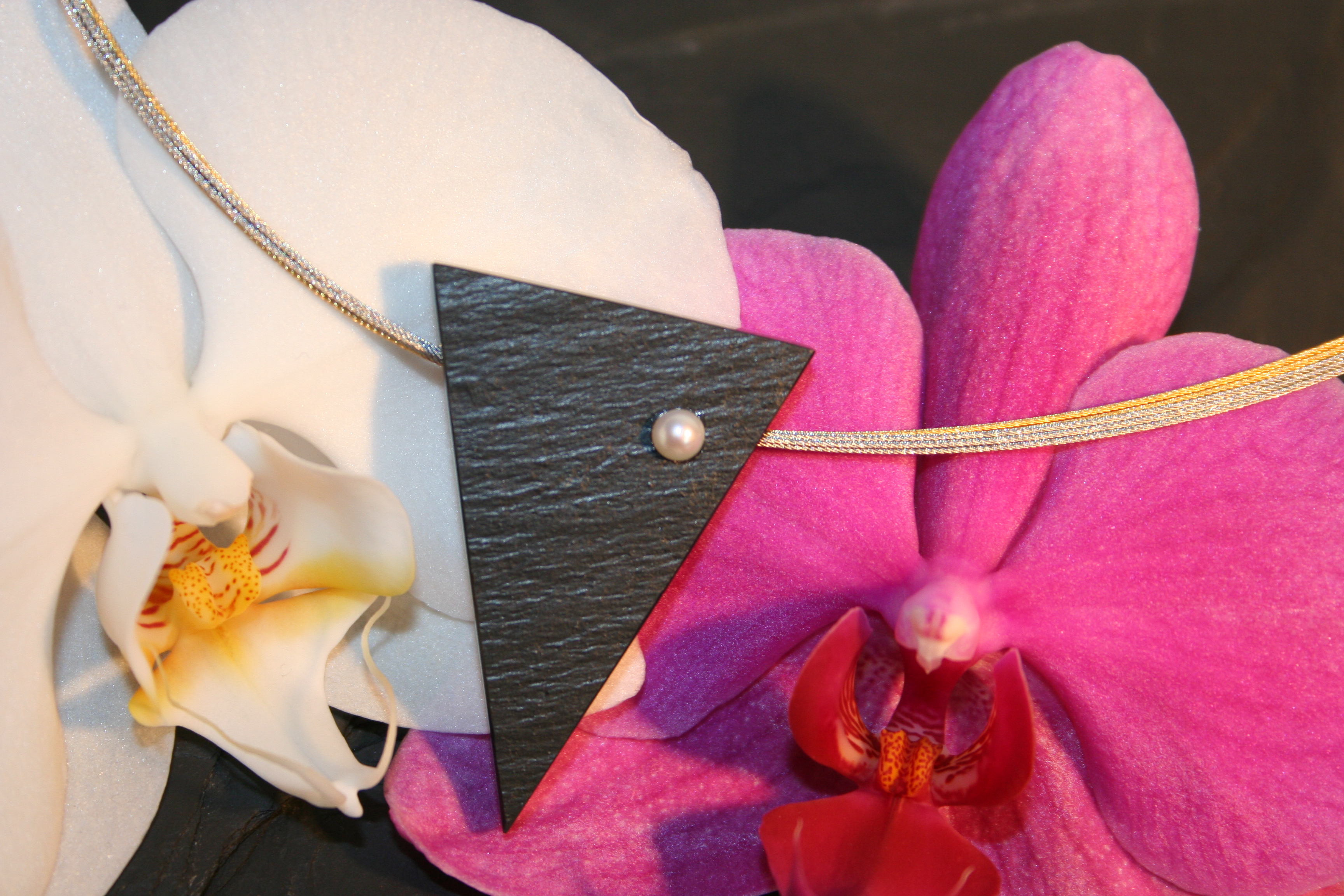 Naturschiefer-Collier Dreieck (ca. 30 x 45 mm) versehen mit einer Süßwasserzuchtperle, an einem