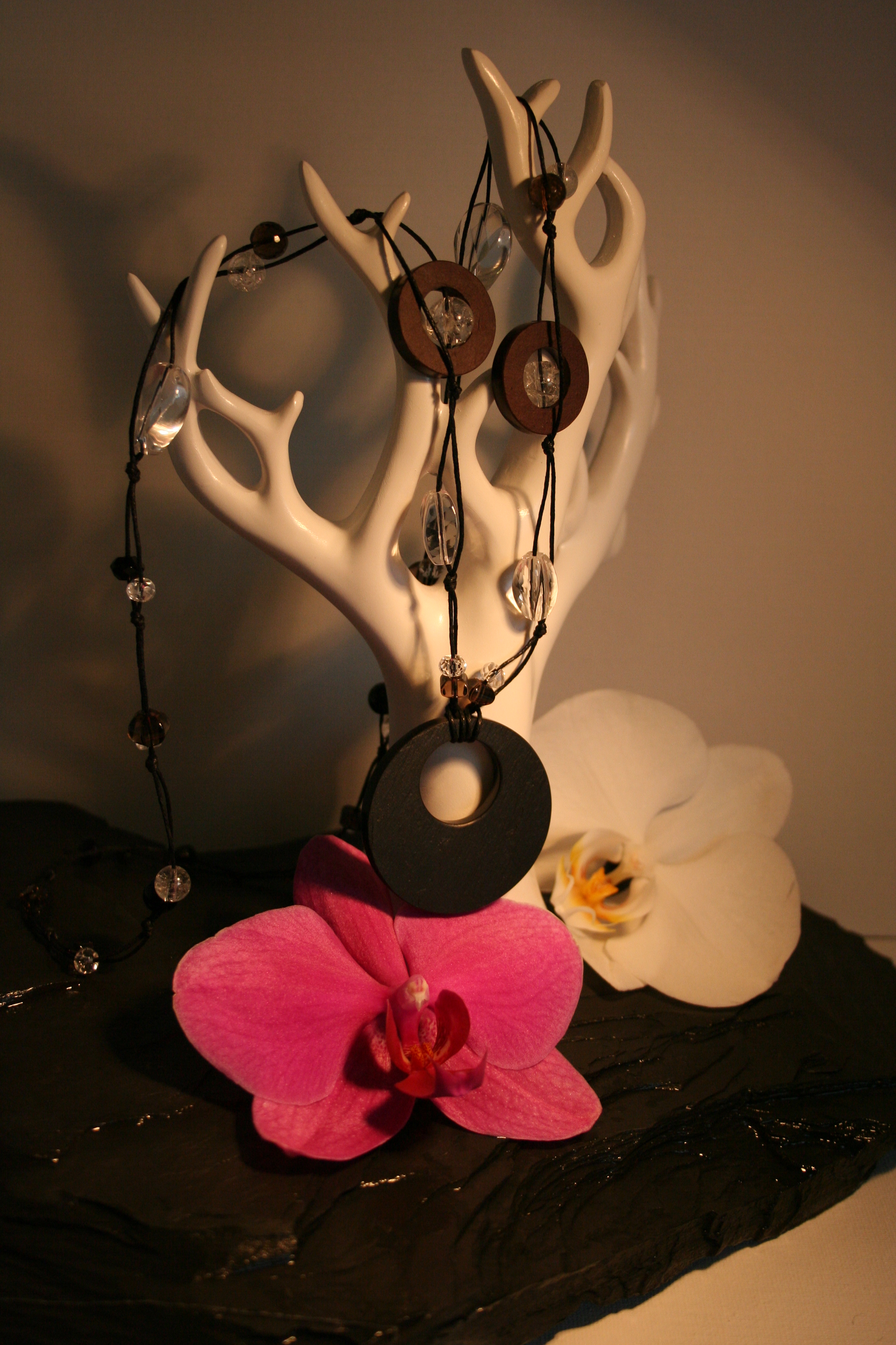 Gebundene Kette aus schwarzem und braunem Naturschiefer, Bergkristall, Rauchquarz und Onyx.