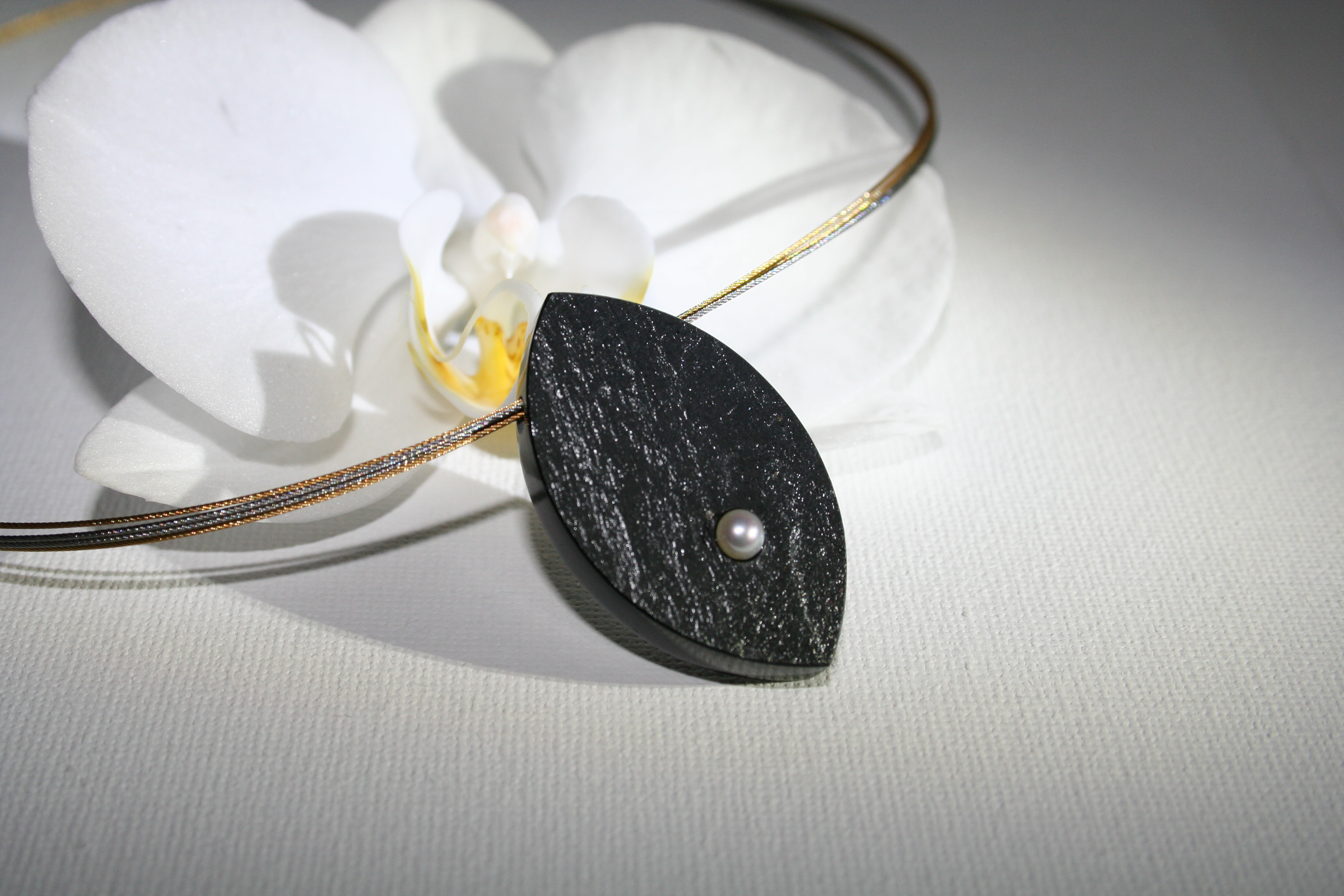 Naturschiefer-Collier Navettenform (ca. 23 x 40 mm) versehen mit einer Süßwasserzuchtperle, an einem