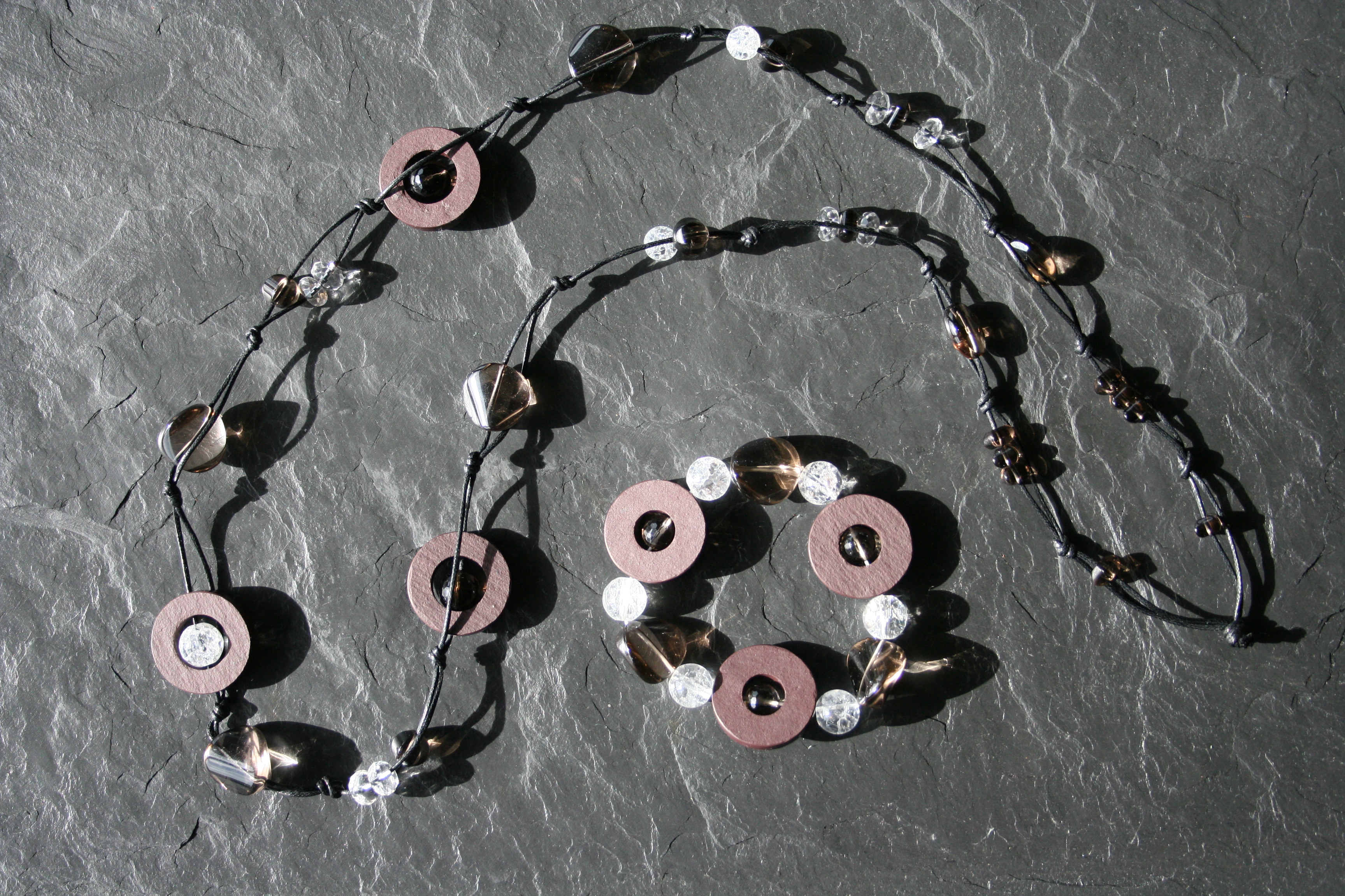 Gebundene Kette und Armband aus braunem Naturschiefer, Bergkristall, Rauchquarz.