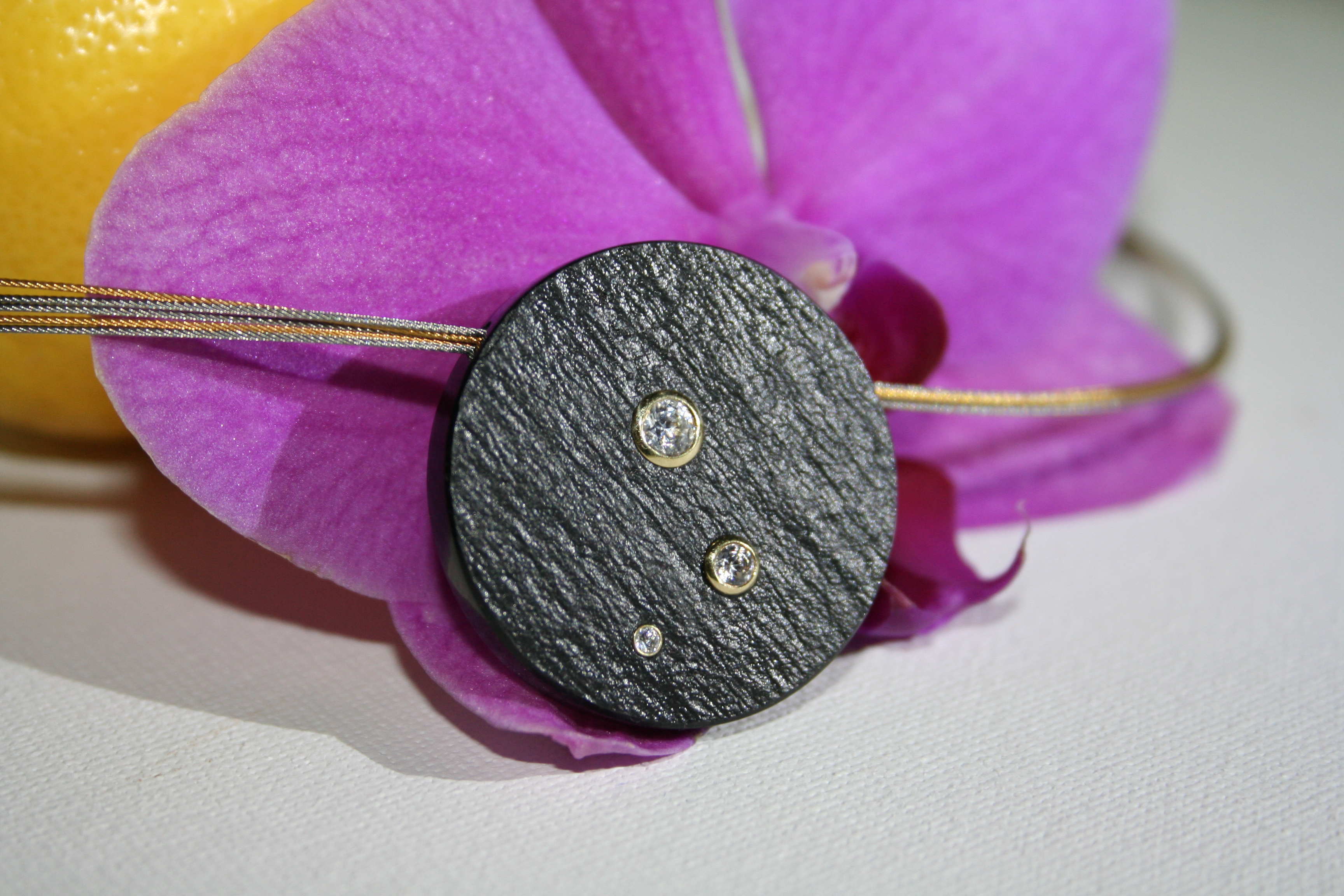 Naturschiefer-Collier (Durchmesser 32 mm) versehen mit drei weißen Zirconia in 14 ct. Gelbgoldfassung